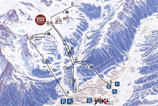 Einen Übersichtsplan vom Skigebiet finden sie auf www.ischgl.com. Das Konzertgelände ist auch ohne Skiausrüstung problemlos mit der Silvrettabahn, der Fimbabahn, der Pardatschgratbahn und Gratbahn erreichbar.