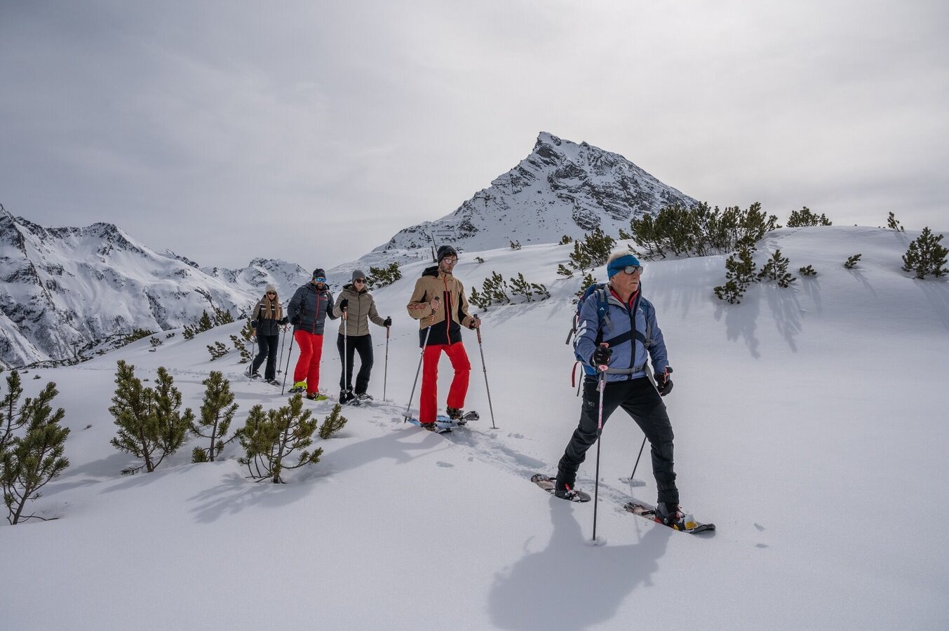 Die Schneeschuhwanderung im Silvapark Galtür führt durch eine malerische Winterlandschaft und verbindet die Gebirgsgruppen Silvretta und Verwall.