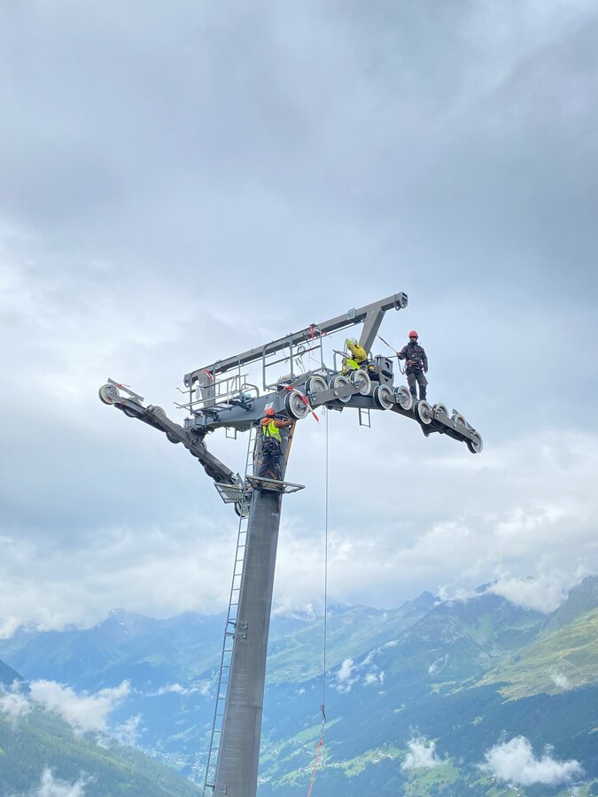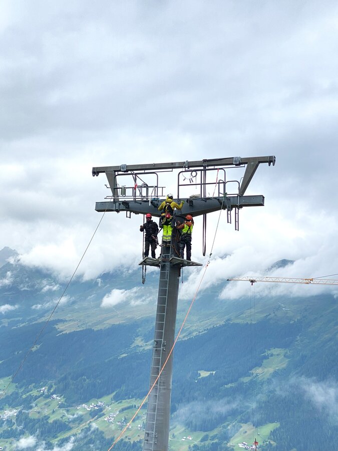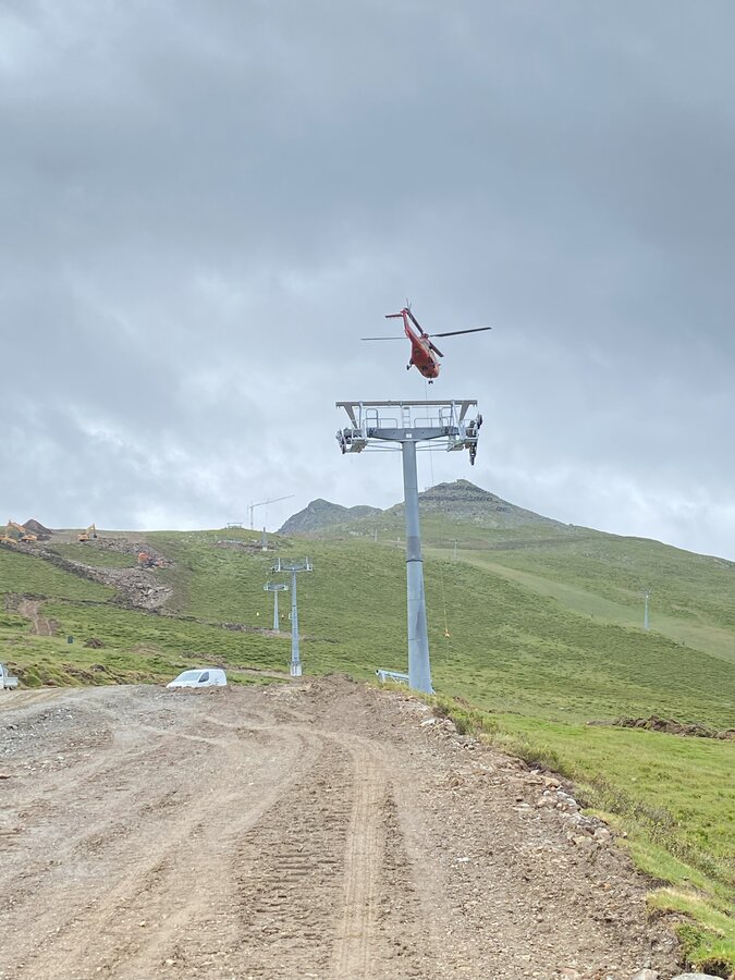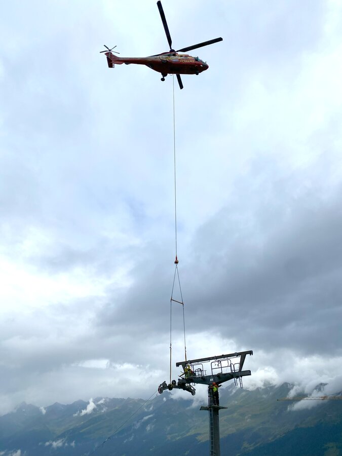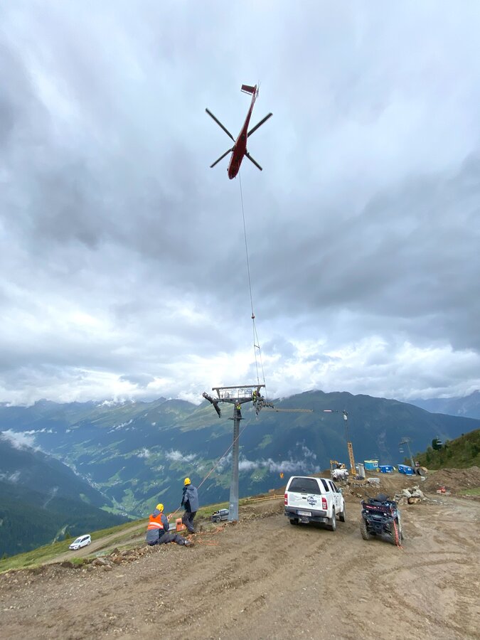 Der Bau der Familienglückbahn geht stetig voran und dieses mal wurden die Stützen aufgestellt. Bei 2 Stützen war es nicht möglich, mit einem Kran bis zum Stützenfundament zu kommen und deswegen wurde auch hierbei ein Helikopter eingesetzt. Es gilt hier auch zu sagen, dass diese Arbeiten von Profis, die aufeinander abgestimmt sind, ausgeführt werden um die Sicherheit zu gewährleisten.