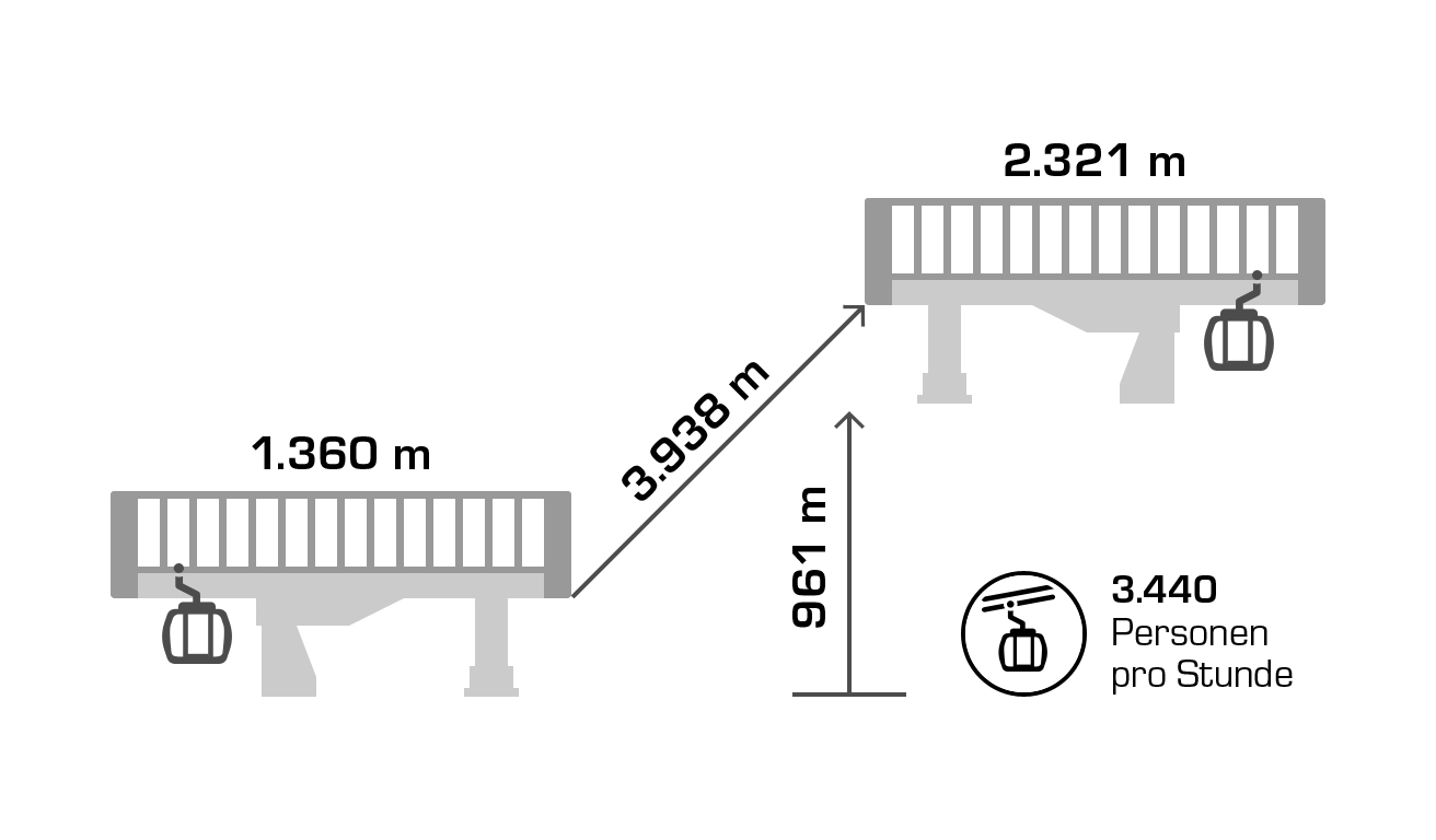 Die Silvrettabahn A1 ist ein einzigartiges Kraftpaket, denn in jeder Kabine finden bis zu 18 Personen Platz. Acht Motoren mit 4.350 PS, unzählige Reifen, Rollen und viele Kilometer Seile ermöglichen eine einzigartige Geschwindigkeit von sechs Metern pro Sekunde. Übrigens: Die Silvrettabahn ist ein Funitel-Modell und somit besonders windsicher!