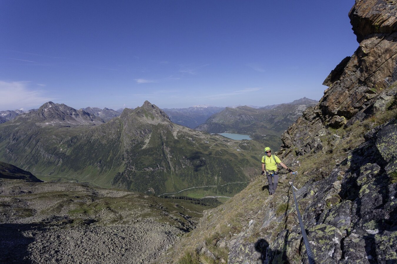 The via ferrata to the Gorfenspitze is more of a challenging mountain path with some via ferrata elements below the peak. The tour starts in Galtür and follows a marked hiking trail through steep grass and rocky areas, requiring sure-footedness. The via ferrata sections are short and have difficulties from A to B. Although partially secured with steel cables in the upper part, the route is technically less demanding in the lower areas, making it a good option for less experienced via ferrata climbers.