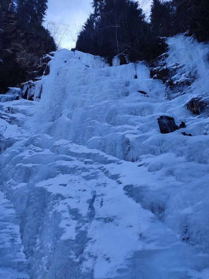 Climb over the bars from the right and follow the nearly overgrown path. At the end of the path (derelict barn), first over the meadow and then through the forest up to the entry point. Exhausting!