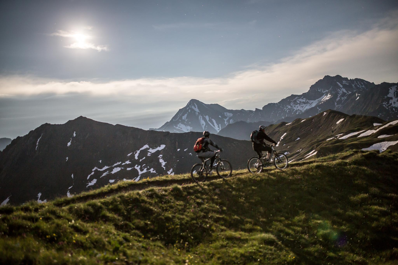 Die aussichtsreiche Tagestour startet am Ortsende von Samnaun Dorf bei der Schmuggleralm (1840 m ü. M.), wo die Forststrasse ins Val Musauna beginnt. Nach dem ersten gemächlichen Anstieg wird die Strecke mit Beginn der ersten Serpentinen steiler. Durch eine schmale, tiefe Schlucht führt der Weg weiter bis zu den Zeblaswiesen auf 2404 m ü. M. Nach weiteren 135 Höhenmeter erreicht man das Zeblasjoch (2539 m ü. M.). Ab hier führt die Tour über den Grat rund um den Palinkopf und weiter zum Salaaserkopf und bietet tiefe Einblicke in den Ravaischer Salaas und das Schneesportgebiet der Silvretta Arena Samnaun/Ischgl. Noch über den Greitspitz und bis zum Viderjoch fährt man stets entlang des Berggrats und der Landesgrenze. Am Viderjoch wartet ein bestens ausgebauter Endurotrail bis zur Alp Trida, der für die Strapazen des Aufstiegs entschädigt. Von der Alp Trida führt die Forststrasse (Achtung, Wanderer) gemütlich zurück ins Tal. Alternativ kann man ab der Alp Trida mit der Sesselbahn zum Alp Trida Sattel und anschliessend mit der Gondelbahn nach Samnaun gelangen.