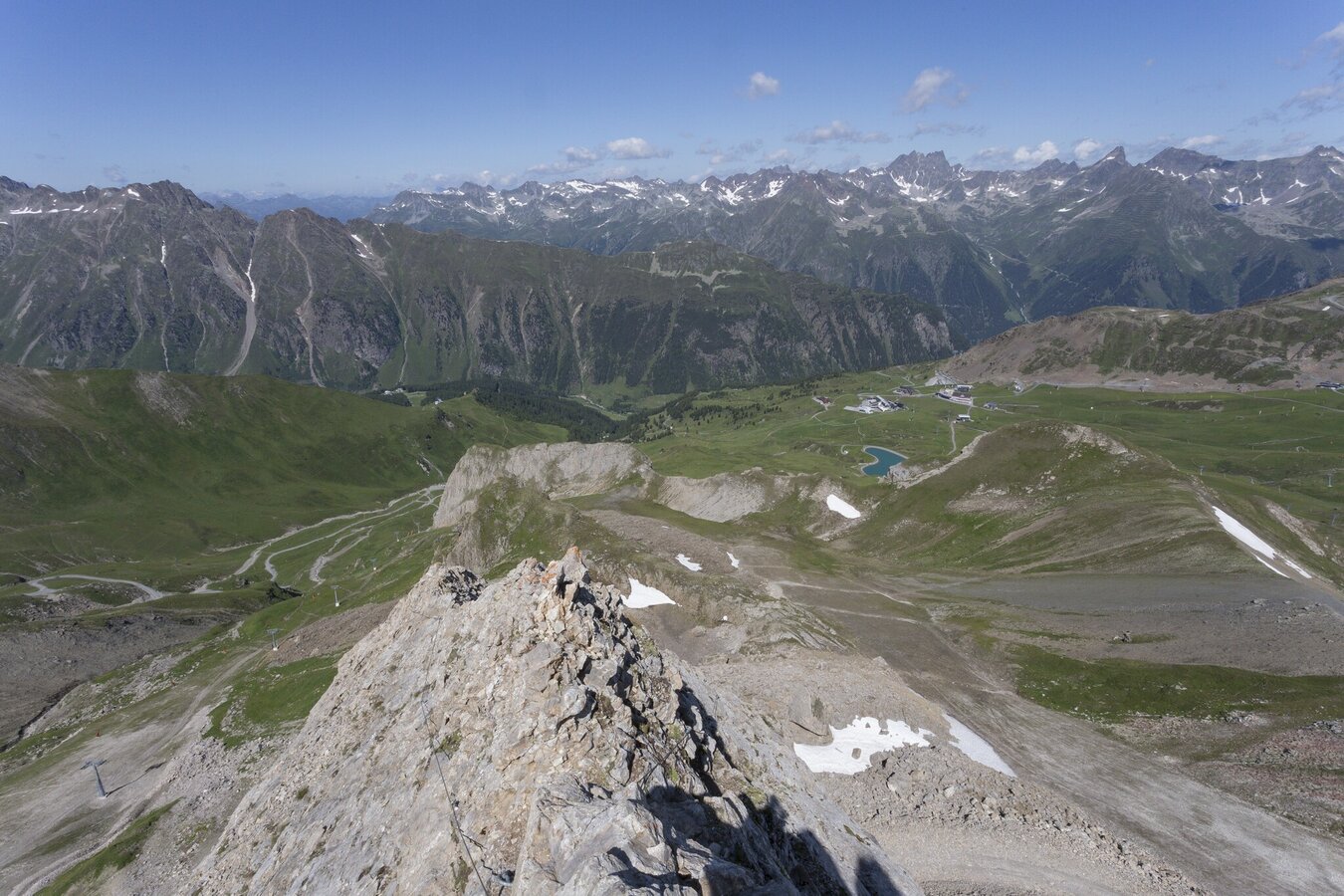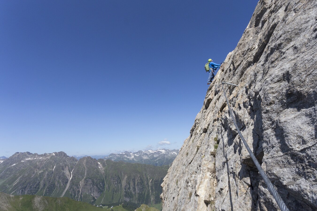 The Greitspitz via ferrata, established in 2001, lies amidst the Silvretta Arena on the border between Ischgl and Samnaun. The tour is technically demanding, featuring slab ramps and vertical walls. Difficulty ranges from B to D, with options to bypass more challenging sections. The route offers spectacular exposed passages, well-secured with staples and foothold pins, although anchor distances can be considerable. Combining stunning vistas with challenging climbing, this via ferrata is suited for experienced climbers.