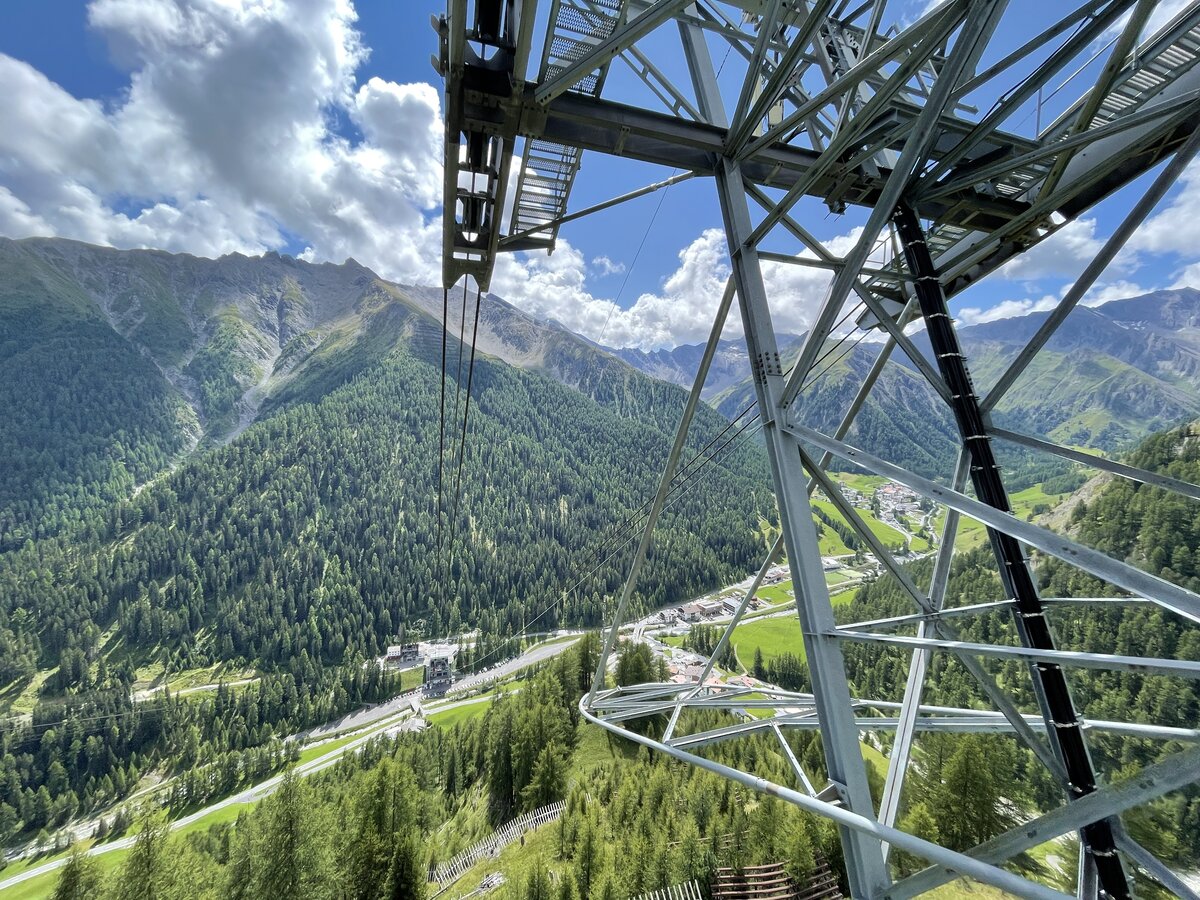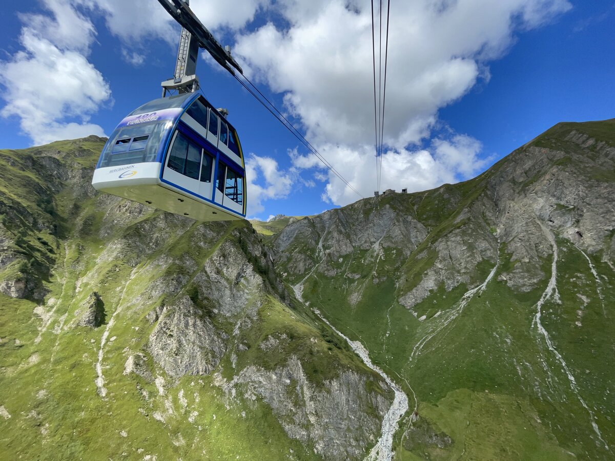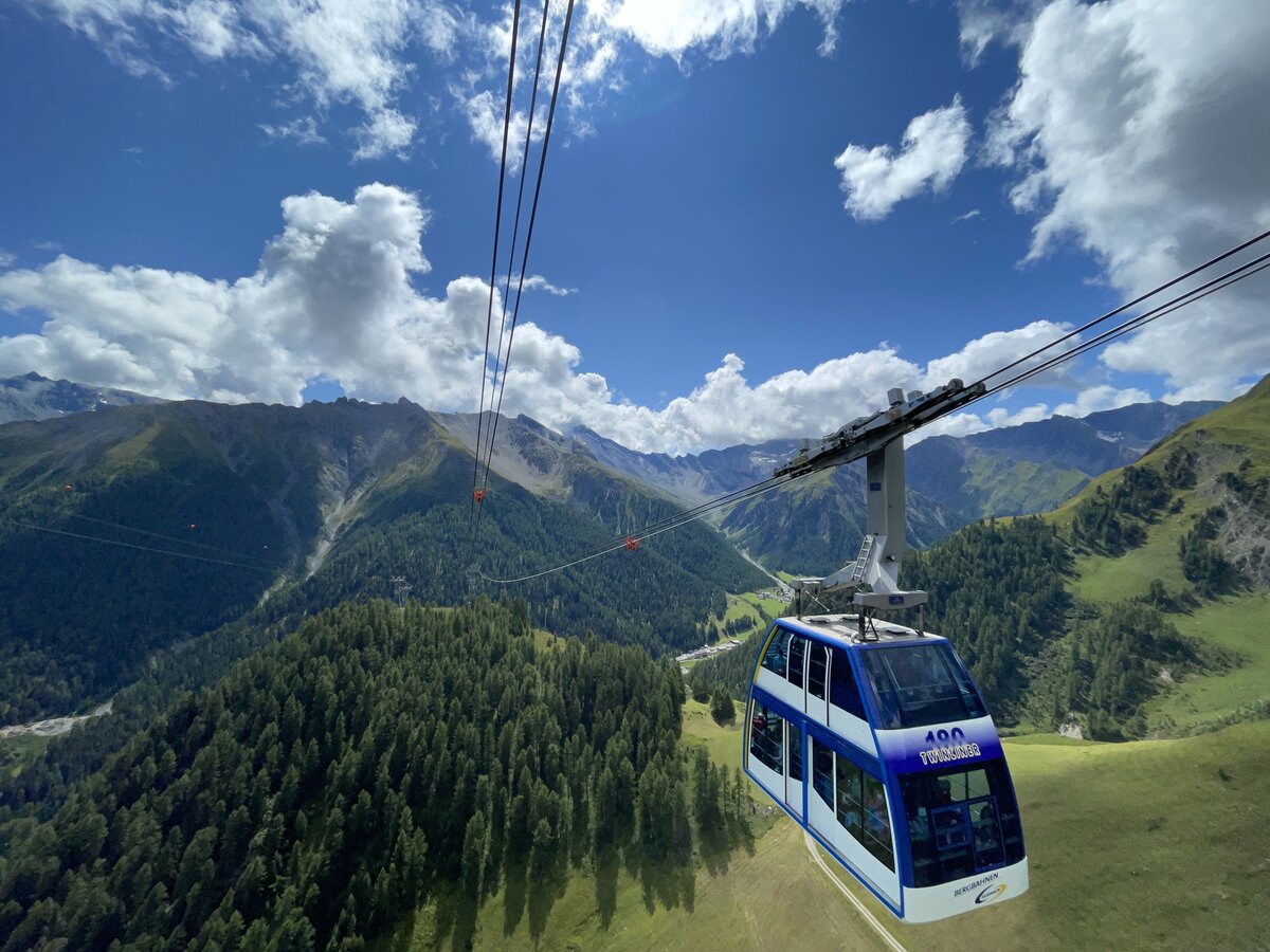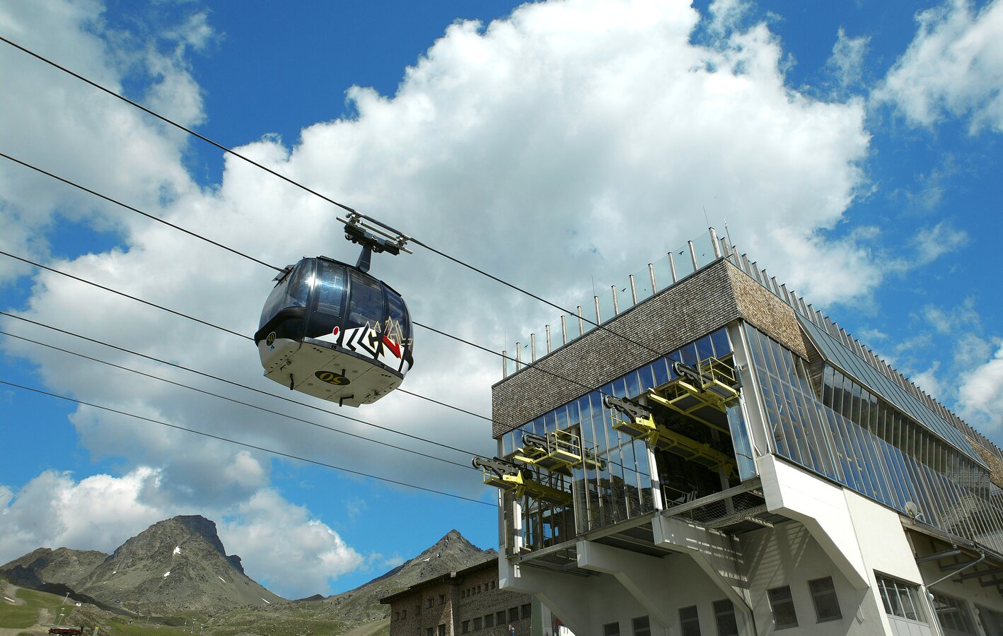 The Twinliner in Samnaun is one of the largest aerial cable cars in the Alps, featuring two double-decker gondolas with a total capacity of 180 passengers, with 110 passengers traveling in the upper and 70 passengers traveling in the lower gondola. The cableway runs with a max. ground clearance of 210 m over 3 pillars from Samnaun to Alp Trider Sattel. Built in 1995, the aerial cableway has a vertical rise of 722 m, a route distance of 2.300 m and a total capacity of 1.620 persons/hour. Maximum speed is 10 m/s, rope diameter is 64mm.