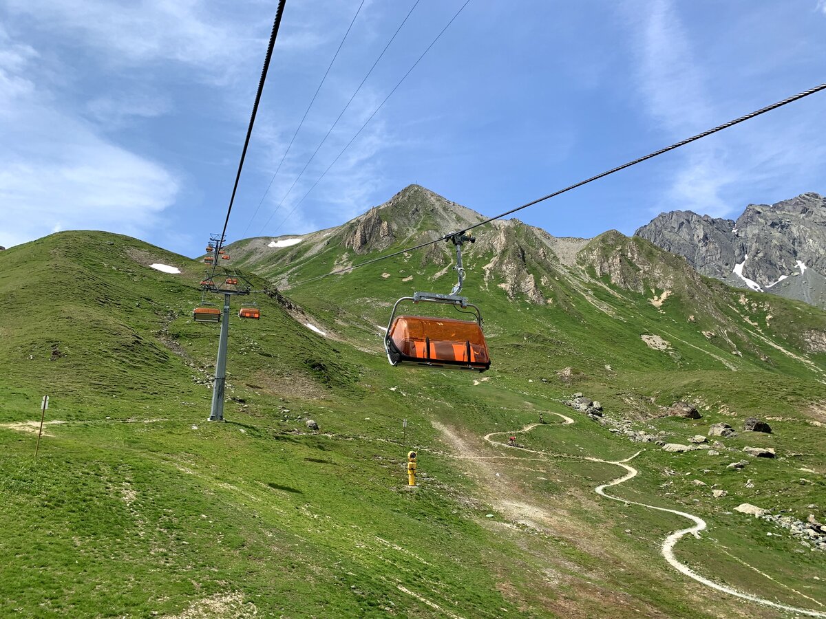 Built in 2000, the detachable chair lift has weather protection bubbles, a total capacity of 2.800 persons per hour and 60 six-person chairs, which travel 1.050 m over 10 pillars up to the mountain station.