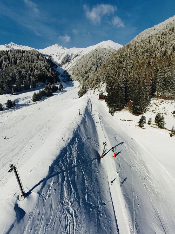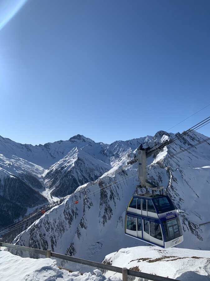 The Twinliner in Samnaun is one of the largest aerial cable cars in the Alps, featuring two double-decker gondolas with a total capacity of 180 passengers, with 110 passengers traveling in the upper and 70 passengers traveling in the lower gondola. The cableway runs with a max. ground clearance of 210 m over 3 pillars from Samnaun to Alp Trider Sattel. Built in 1995, the aerial cableway has a vertical rise of 722 m, a route distance of 2.300 m and a total capacity of 1.620 persons/hour. Maximum speed is 10 m/s, rope diameter is 64mm.