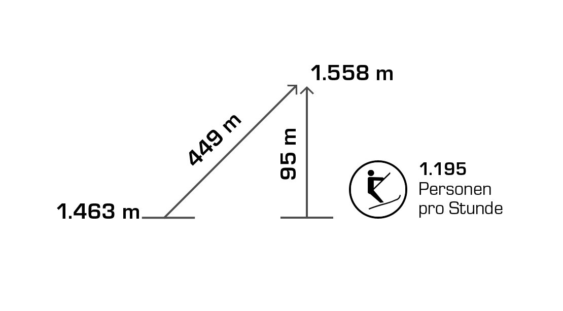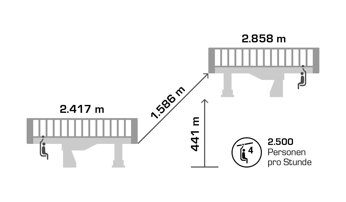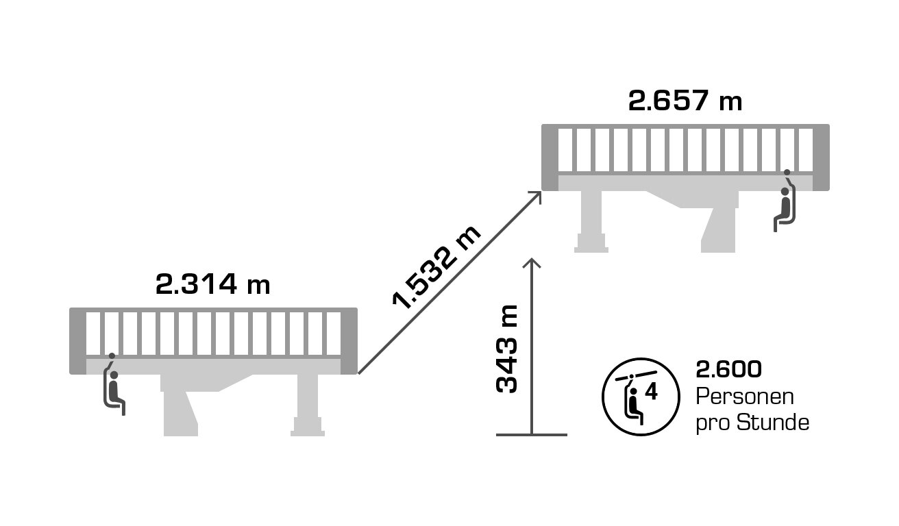 Built in 2000, the detachable chair lift has weather protection bubbles, a total capacity of 2.800 persons per hour and 60 six-person chairs, which travel 1.050 m over 10 pillars up to the mountain station.