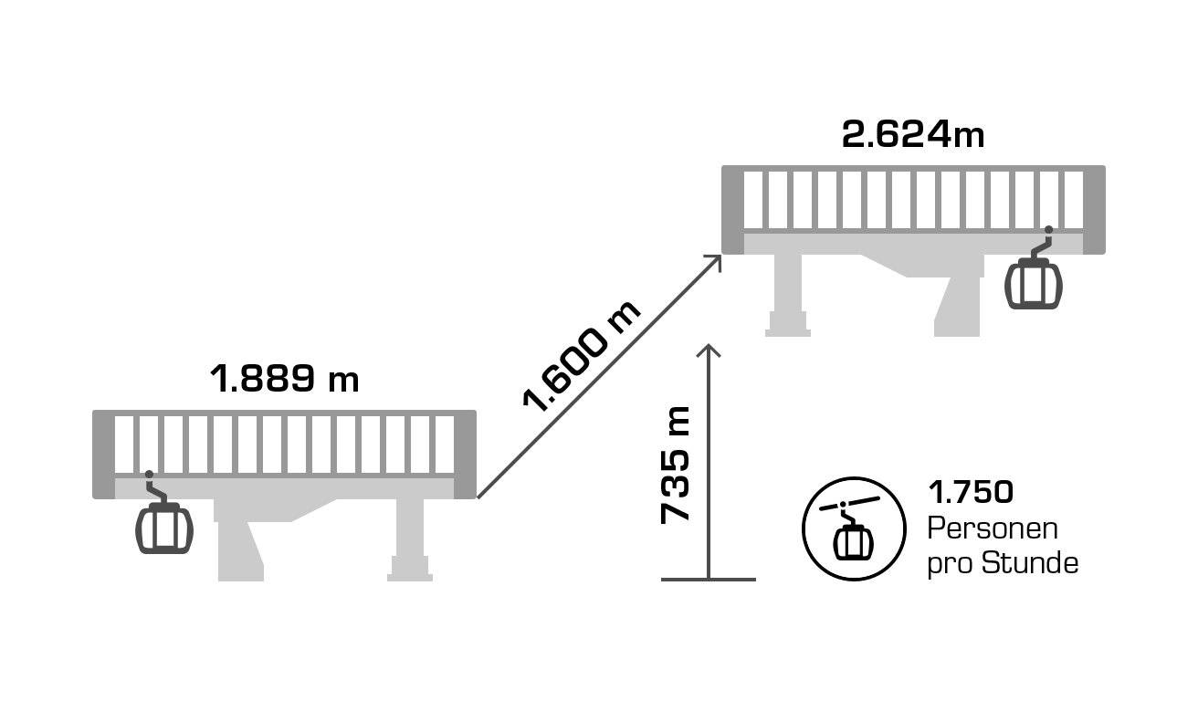 Its 24-passenger bicable ropeway design (funitel system) facilitates safe operation even at wind speeds of 100 km/h. 63 gondolas run from Ischgl to Idalp with a maximum line speed of up to 6 m/s.