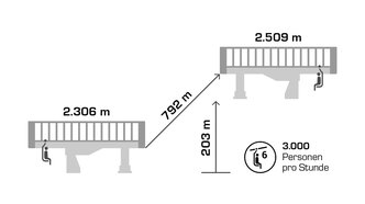 The transport system has a total of 23 pillars with a height of up to 23 m. 8 motors with a total capac i ty of 3.200 kW (4.350 PS) are required for the operation of the Silvrettabahn.